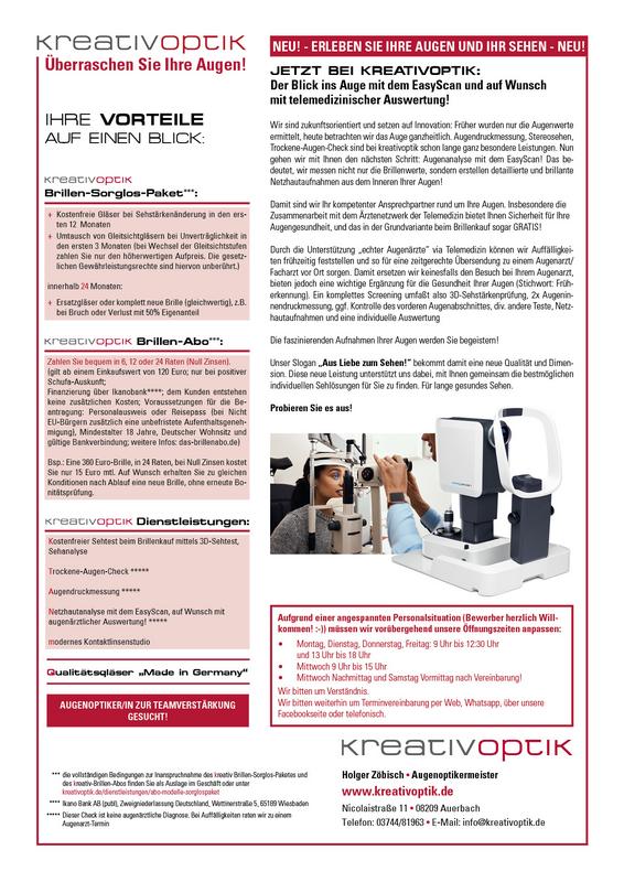 *bis zu 50 % Preisnachlass ab dem 09.01.26 auf alle vorrätigen Brillenfassungen und Sonnenbrillen auf den regulären Verkaufspreis der letzten 30 Tage.